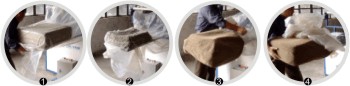 The machine puts covers onto cushions using suction pressure.